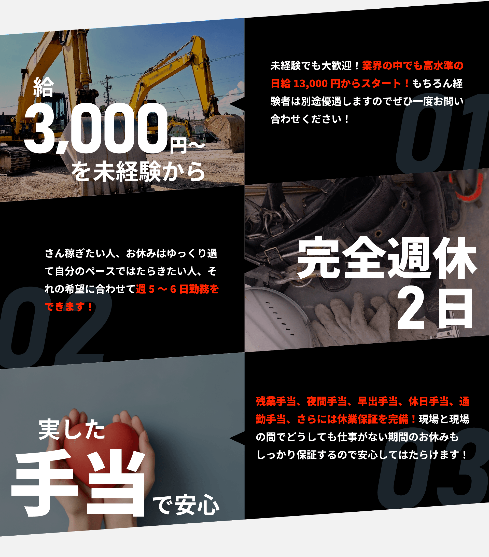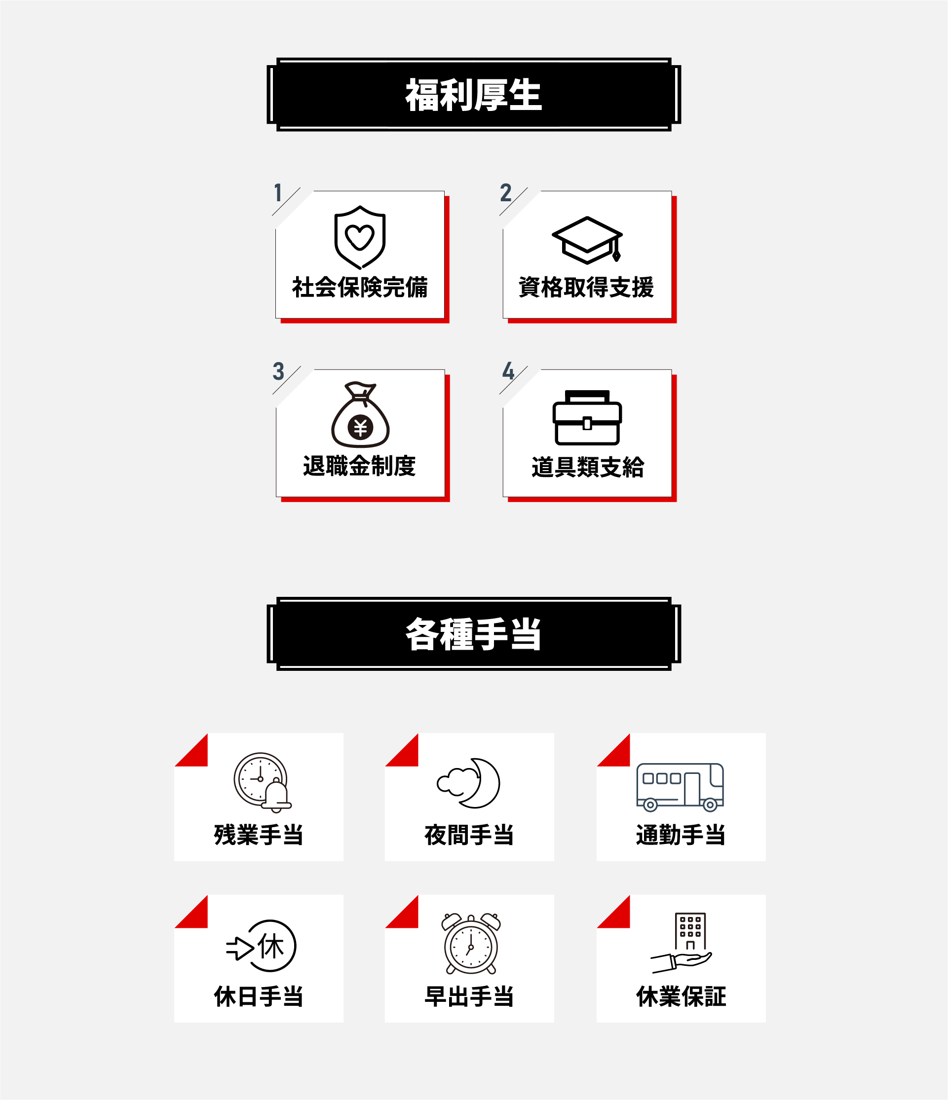 ・社会保険完備 ・道具類支給 ・資格取得支援制度(全額補助) ・通勤手当 ・休日手当 ・残業手当 ・夜間手当 ・早出手当 ・休業保証 |