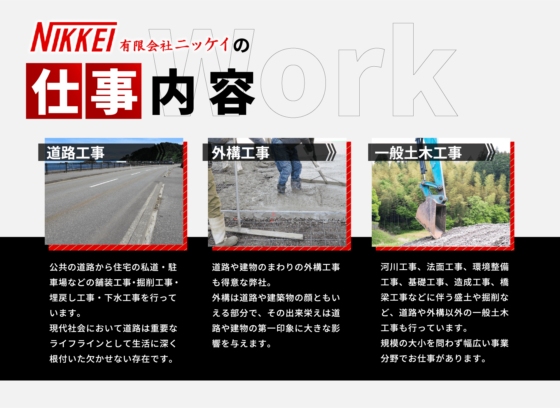 | 業務内容 | 道路舗装工事 下水道工事 外構工事 一般土木工事 |