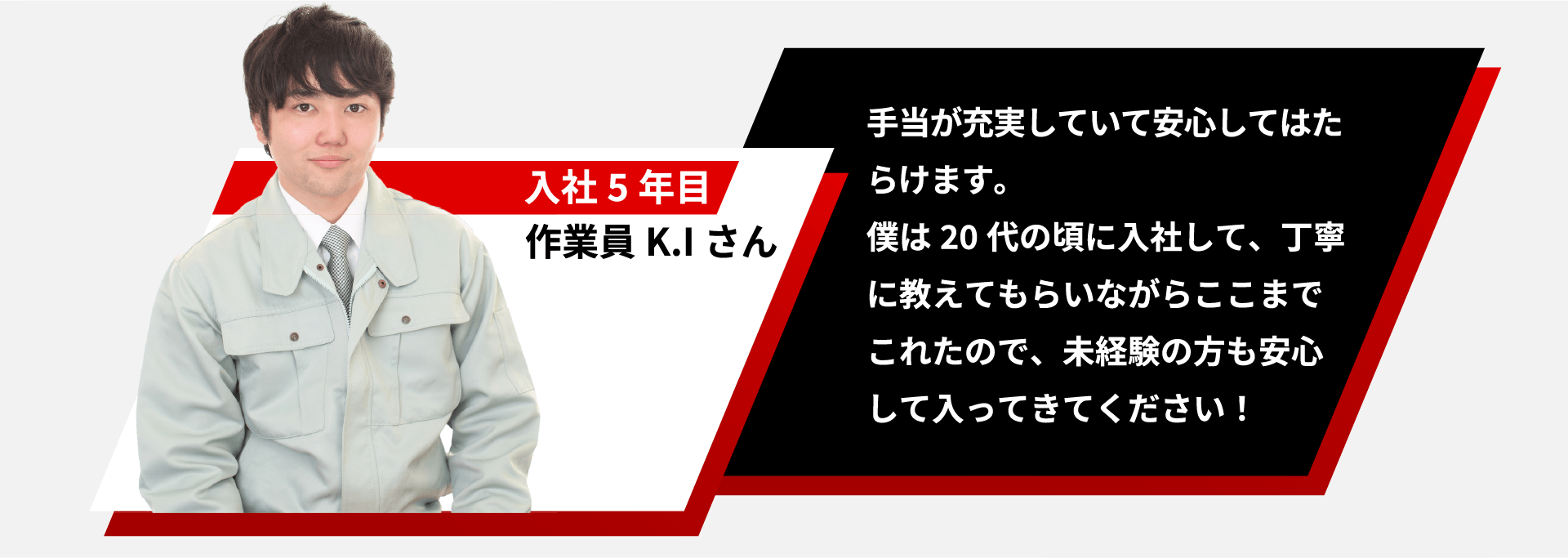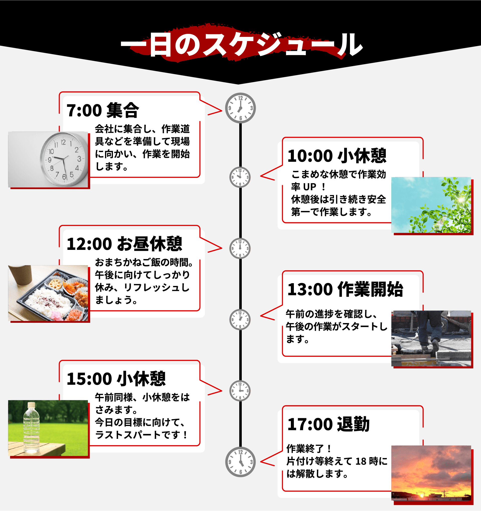 | 勤務時間 | 8:00~17:00 ※現場によって異なることがあります |