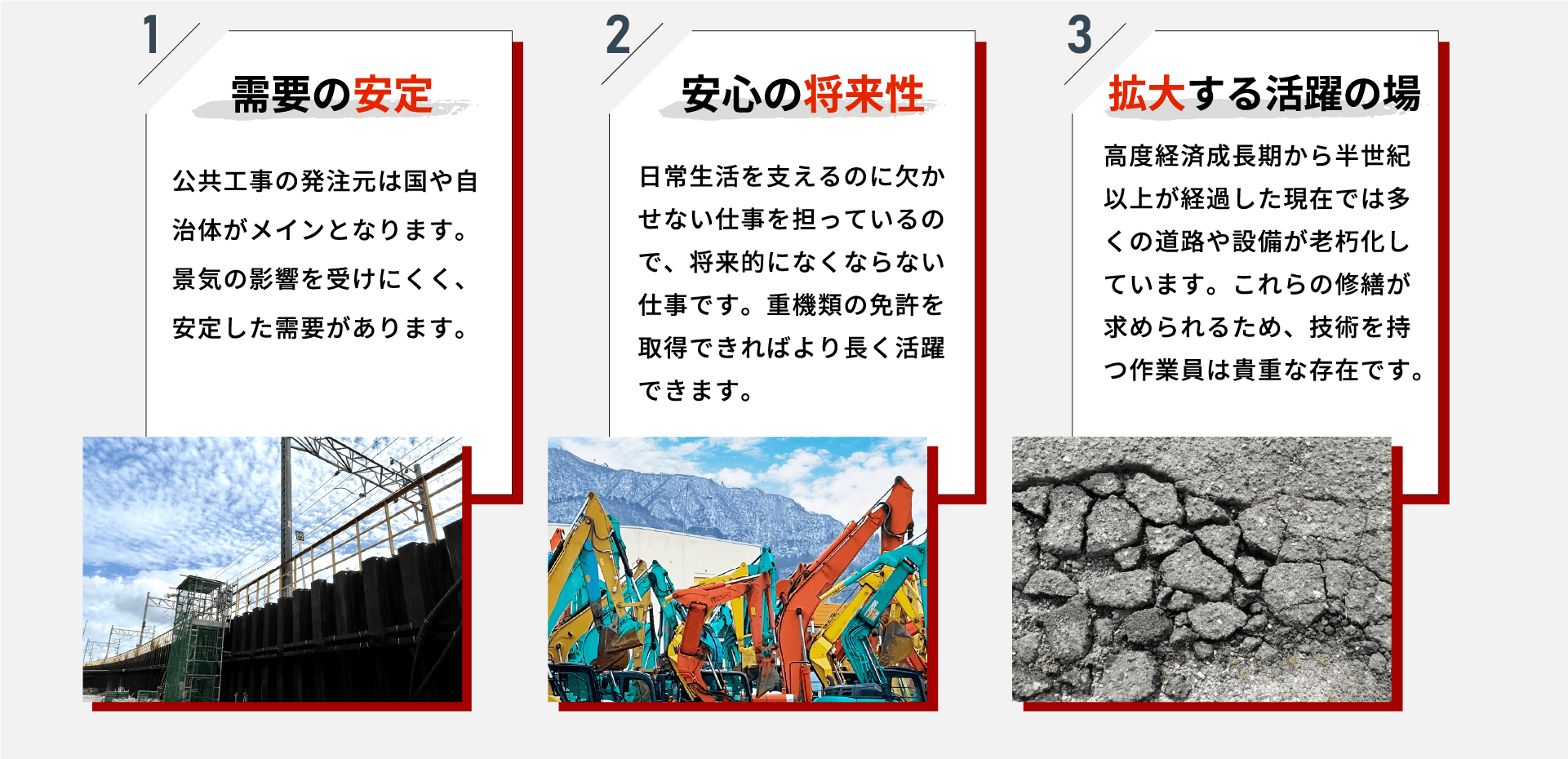 | 職種 | 土木作業員 オペレーター 現場監督 |